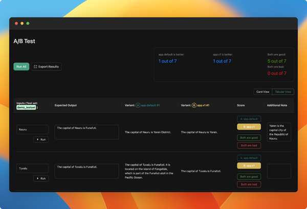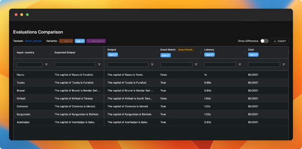 - Comparative Analysis: Select multiple evaluation runs and view the results of various LLM applications side-by-side.